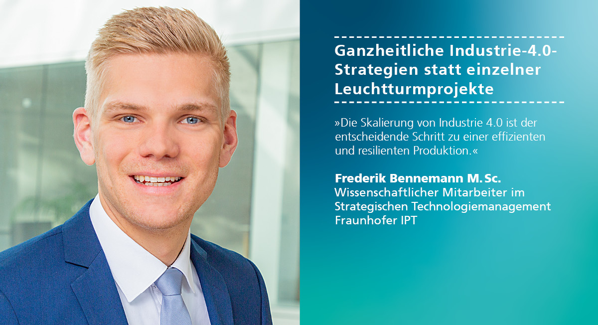 Im Zuge der Coronapandemie hat sich der Handlungsdruck für Unternehmen erhöht – sie müssen resilienter und gleichzeitig effizienter wirtschaften. Jedoch ist eine gängige Annahme, dass Resilienz und Effizienz für produzierende Unternehmen gegenläufige Ziele sind. Die Industrie 4.0 kann einen Beitrag zur Auflösung dieses Spannungsfelds leisten. Allerdings ist für viele Unternehmen die operative Umsetzung von Industrie 4.0 nach wie vor eine größere Herausforderung. Während die Implementierung ausgewählter und vereinzelter Pilotprojekte vielfach gelingt, scheitern viele produzierende Unternehmen im Anschluss ander breiten Skalierung. Diese ist jedoch unabdingbar, um die gesamtheitlichen Vorteile von Industrie-4.0-Lösungen nachhaltig umzusetzen.