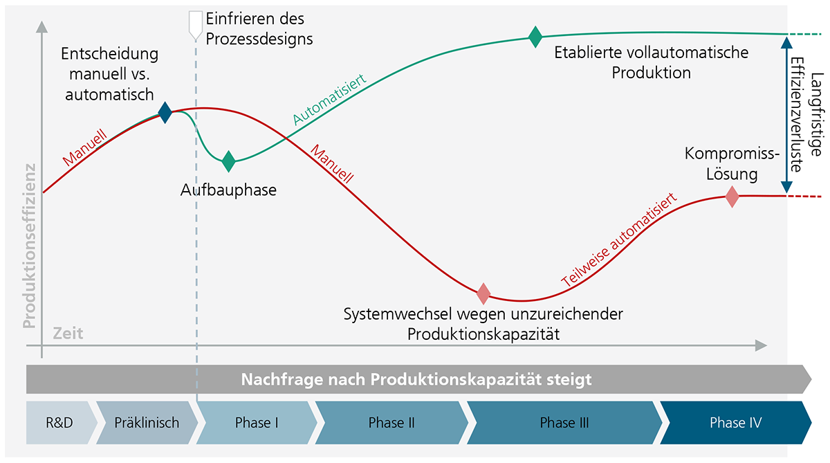 Abbildung 10 verdeutlicht qualitativ, dass es aus produktionstechnologischer Sicht sinnvoll ist, bereits möglichst früh im Produktentstehungsprozess eine automatisierte Herstellung zu etablieren. Bei der Entwicklung eines neuen Biopharmazeutikums ist in der Erforschung sowie in der Phase der präklinischen Zulassung ein manueller Betrieb durchaus effizient und sinnvoll. Beim Übergang in die klinischen Studien, muss der Herstellungsprozess klar definiert sein und kann später nur noch unter hohem regulatorischem Aufwand verändert werden. Ist der Prozess bis zu diesem Zeitpunkt also noch nicht für eine Automatisierung ausgelegt, muss die Produktion längerfristig manuell betrieben werden.