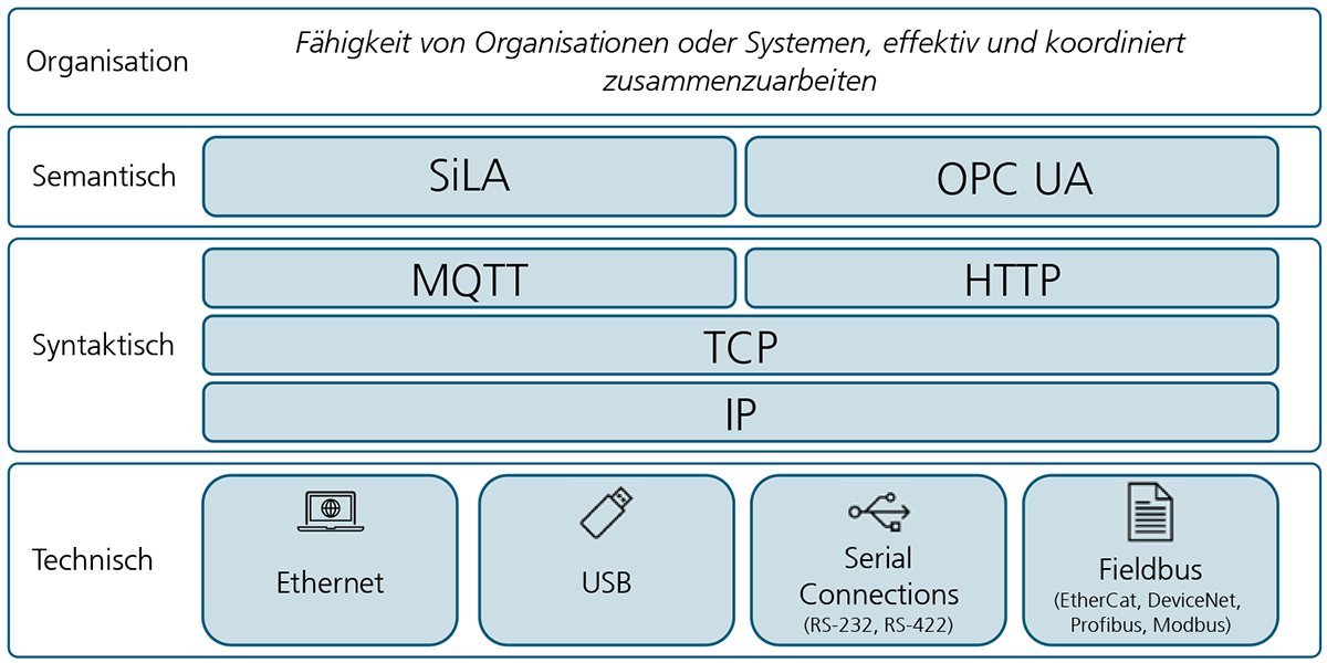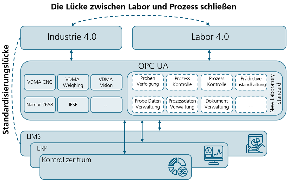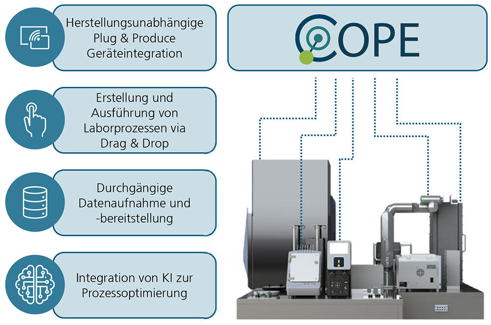 Digitalisierung und Vernetzung im Labor bieten den Lebenswissenschaften Potenzial für den Einsatz neuer Technologien, wie beispielsweise automatisierte KI-getriebene Screeningverfahren, die in der Biotechnologie die Entwicklung neuer Wirkstoffe beschleunigen kann [1], [2]. Heute herrscht in den meisten Laboren eine vielfältige Geräteausstattung verschiedener Hersteller, die nur begrenzt durch elektronische Unterstützung harmonisiert werden kann. Das Zusammenführen und Kontextualisieren der erzeugten Daten gestaltet sich daher kompliziert, fehleranfällig und zeitaufwändig. Deshalb wird eine Vielzahl der Labortätigkeiten heute immer noch manuell durchgeführt. Anstatt die Daten elektronisch zu integrieren, werden Ergebnisse und Messdaten von den Geräten in Systeme zumeist immer noch manuell übertragen. Doch mit zunehmender Anzahl der manuellen Schritte steigt die Wahrscheinlichkeit von Fehlern in den Daten [1], [2]. Wie aber lässt sich die Laborvernetzung und der Datenaustausch zwischen Laboren, individuellen Geräten und vorhandenen Softwarelösungen praktisch umsetzen?